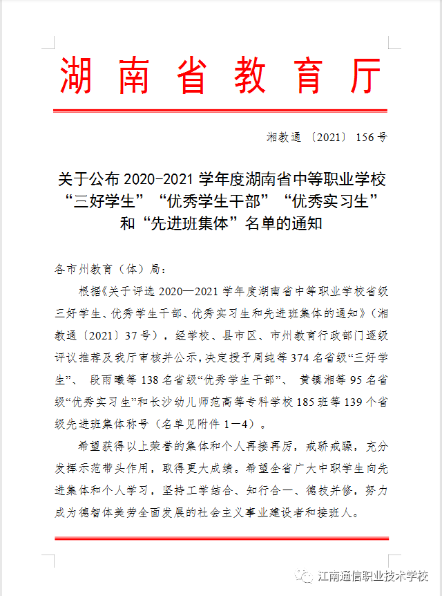 經學校評議、推薦,岳陽市教育局、湖南省教育廳審核評定2020-2021學年度湖南省中等職業(yè)學?!笆〖壢脤W生、優(yōu)秀學生干部、優(yōu)秀實習生、先進班級體”評選結果新鮮出爐!